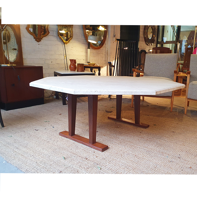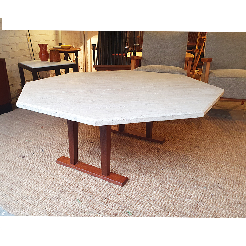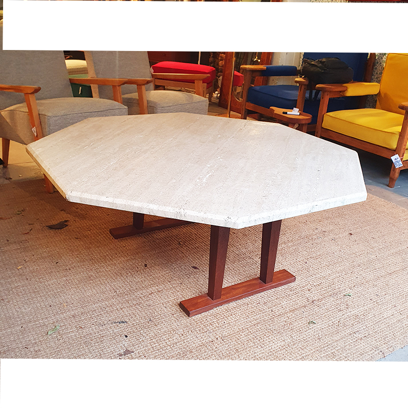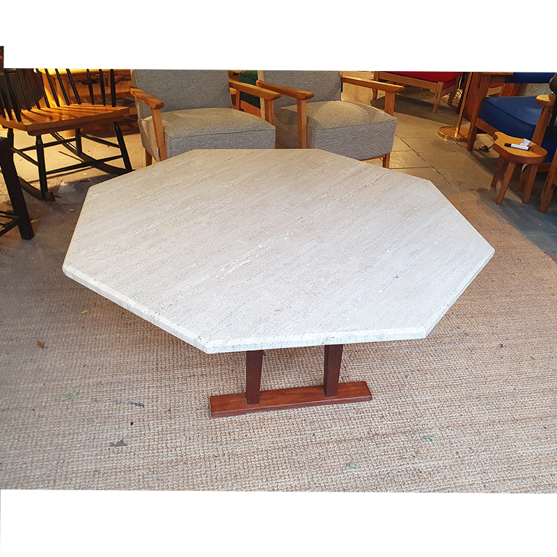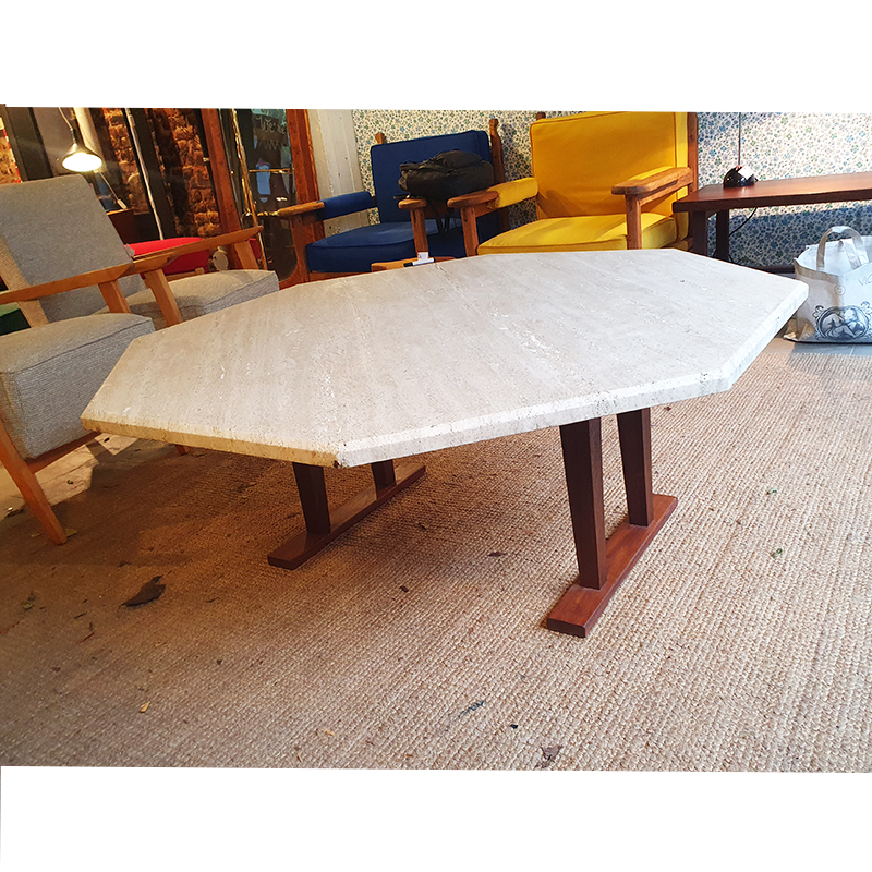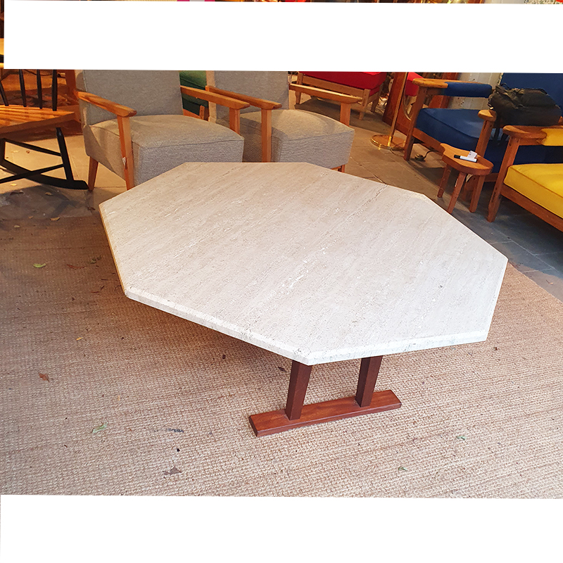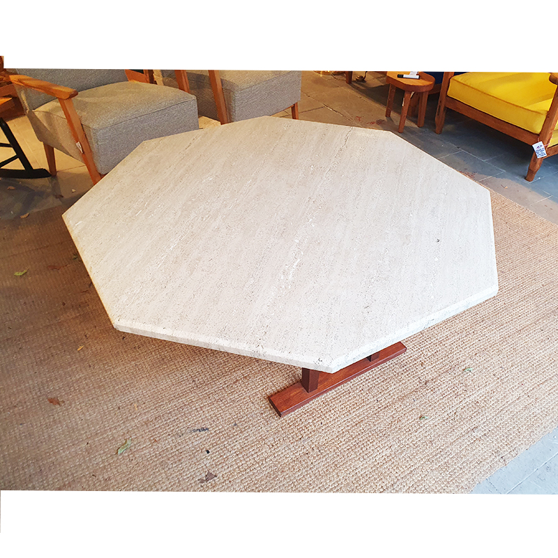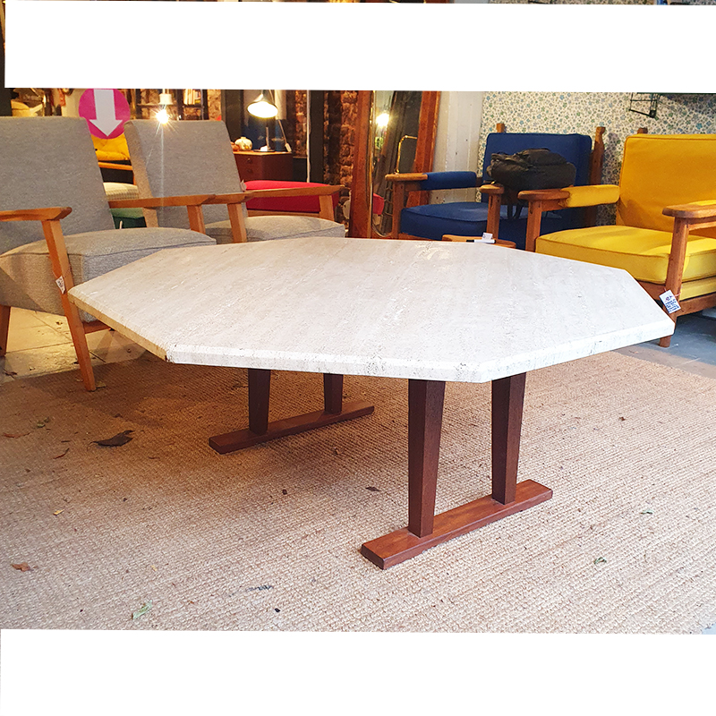 Table basse octogonale en travertin. Piétement en bois massif